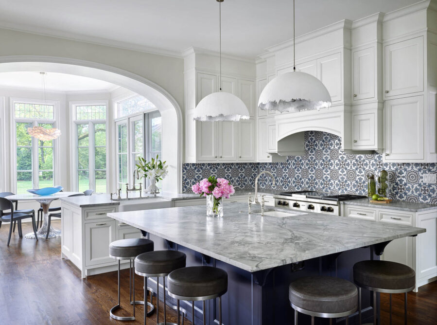 We love a white kitchen as much as everyone else – especially when it includes a few colorful details to make it stand out from every other white kitchen. Here, a quilt-like tile backsplash and navy island base kick this classic white kitchen up a notch and give it a big dose of personality.