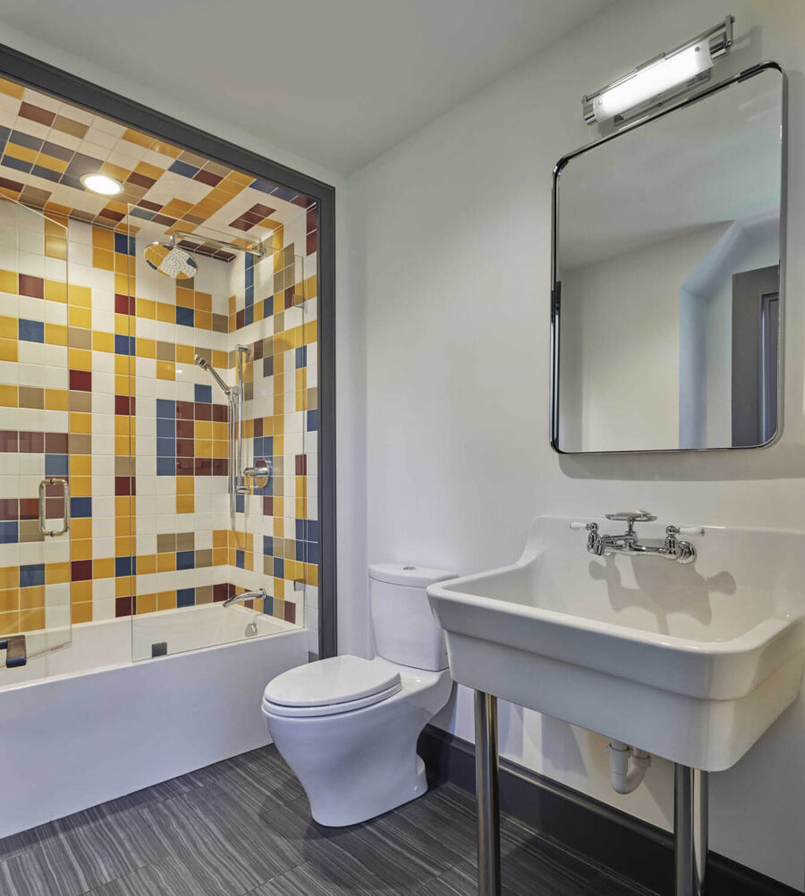 This all-white bathroom is a fooler, because your eye is drawn to the colorful tile surrounding the tub. But if you look closely, it’s the only color in the whole space. This is one of our favorite tricks for adding interest to an otherwise-white room. (It’s also one of our favorite tricks when we want to make the most of a budget without sacrificing style. All we did here was order one tile in a few different colors to create our own custom pattern – which looks a lot more expensive than it actually was.)