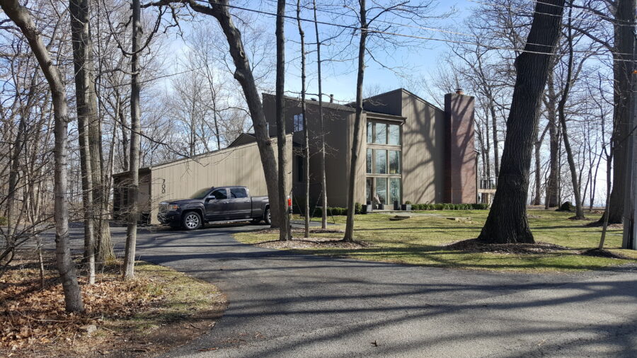 Let’s start with the back story. The house was originally built in the 1980s and was a lackluster example of postmodern-era architecture. And, it had a woodpecker-damaged wood exterior. Our clients originally fell in love with the property’s location and heavily wooded setting on a ravine, both of which were fantastic. But they wanted to make some changes to the house itself, and approached us with the idea of a small renovation.