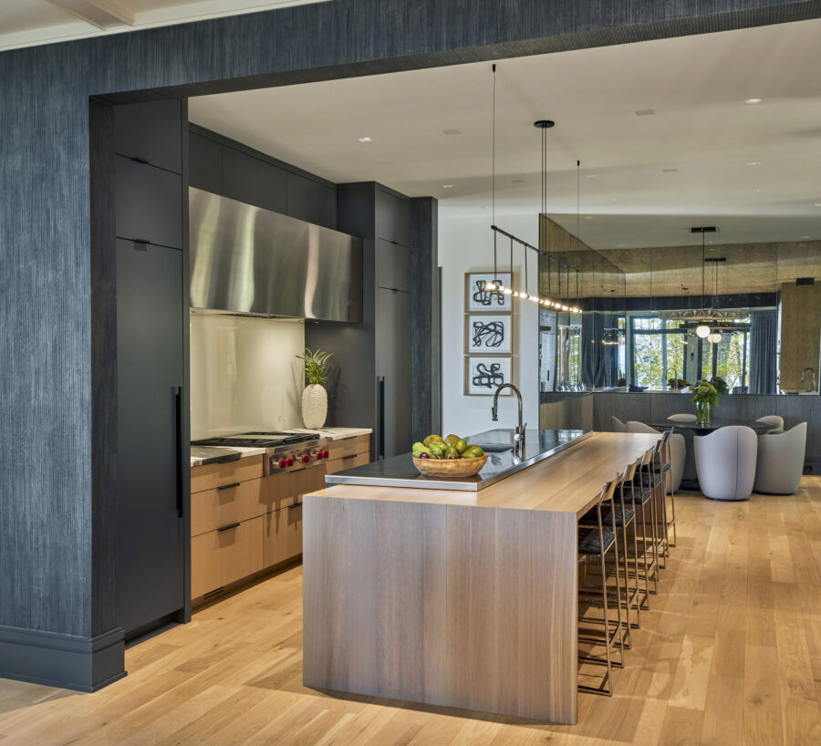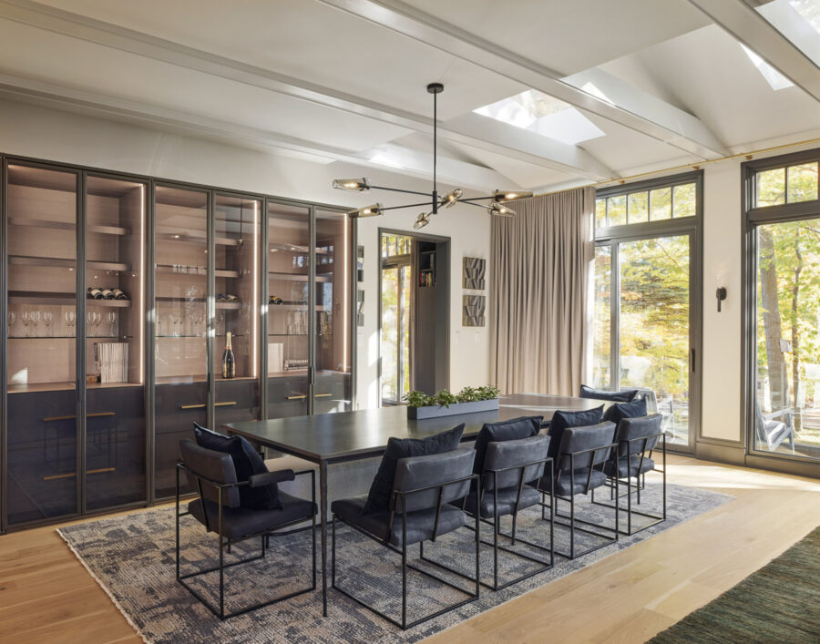The dining room is contemporary in a different way. Its glassed-in wine pantry is the focal point, just as a really great piece of art might be. The chandelier is like a piece of art as well, and then of course the trees are celebrated and enjoyed through the windows. It was also really fun to do a mix of bench seating and dining chairs, which elevates the whole experience of eating here.