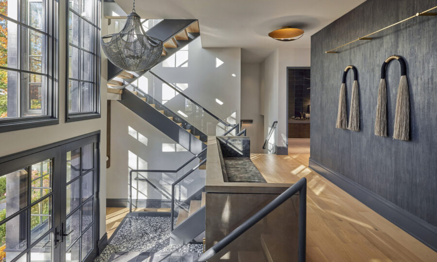 If you know our work, you know we love a statement-making staircase. This one features floating slats and a railing that looks like leather. It’s very graphic; very contemporary. The entry is done in terrazzo partially covered by a mohair rug, with a gray, faux-suede coat closet.